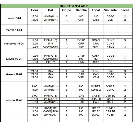 El plato fuerte llegará el sábado, con una extensa tira de partidos desde la mañana hasta la tarde. La jornada comenzará a las 9 con encuentros de Mini e Infantiles U13 en distintas canchas, destacándose la actividad en Hindú Club y Club Atlético Sarmiento. A lo largo del día también habrá acción en Cadetes (U15) y Juveniles (U17), con cruces entre equipos “B” que buscan consolidar su desarrollo competitivo.