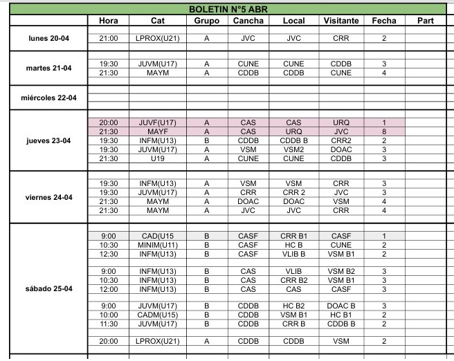 Con actividad programada del lunes 20 al sábado 25, el Boletín N° 5 refleja el dinamismo de una competencia que continúa consolidándose en el ámbito local, con encuentros en múltiples canchas de la ciudad y una participación sostenida de clubes tradicionales.